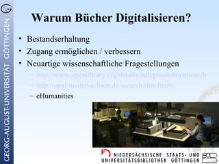 Das Dokument befasst sich mit der Notwendigkeit und den Vorteilen der Digitalisierung von Büchern in der deutschen digitalen Bibliothek, einschließlich der Bestandserhaltung und der Verbesserung des Zugangs. Es beschreibt die organisatorischen und technischen Infrastrukturen sowie die Benutzeranforderungen und Usability-Aspekte, die bei der Gestaltung der digitalen Bibliothek berücksichtigt werden müssen. Darüber hinaus wird auf die Einbettung in europäische Initiativen und die Notwendigkeit von Standards für digitale Inhalte hingewiesen.