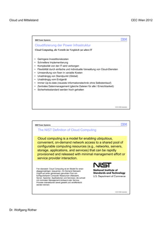 Das Dokument behandelt die Cloudifizierung von Infrastrukturen, insbesondere im Kontext von IBM Power Systems und deren Vorteile, wie geringere Investitionskosten, schnellere Implementierung und zentrales Datenmanagement. Es beschreibt die grundlegenden Funktionen und Modelle des Cloud Computings, einschließlich der NIST-Definition sowie der verschiedenen Service- und Bereitstellungsmodelle. Außerdem werden wichtige Softwarelösungen wie IBM Systems Director und VMControl zur Verwaltung virtueller Ressourcen vorgestellt, die automatisierte Prozesse und optimierte Cloud-Umgebungen ermöglichen.
