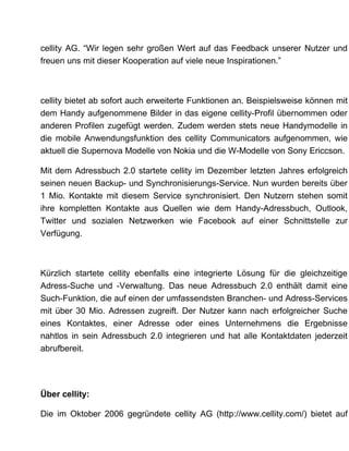 Cellity erweitert seine Präsenz im Mobilfunkmarkt durch die Bereitstellung neuer Funktionen wie mobile Profilbearbeitung und Adresssuche, die ab nächster Woche allen E-Plus-Kunden im Rahmen des beta2go-Programms zur Verfügung stehen. Bereits über 1 Million Kontakte wurden synchronisiert, und die Nutzer können ihre Daten aus verschiedenen Quellen effizient verwalten. Cellity zielt darauf ab, durch das Feedback der Nutzer innovative Ansätze zu entwickeln und die mobile Anwendung weiter zu verbessern.