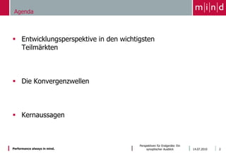 Das Dokument analysiert die Entwicklungsperspektiven in den Teilmärkten für Endgeräte, insbesondere in den Bereichen Mobiltelefone, Computer und Displays, die zusammen etwa 70% des Umsatzes ausmachen. Es identifiziert Trends wie die Verbreitung von Hybrid- und HD-TV, den Übergang von Desktop- zu mobilen Computern sowie den Aufstieg von Smartphones und deren Einfluss auf den Markt. Ferner wird das wachsende Potenzial des Internets der Dinge und mobile Anwendungen hervorgehoben, während die Entwicklungen in den Wertschöpfungsketten und die Bedeutung von Nutzererfahrungen betont werden.