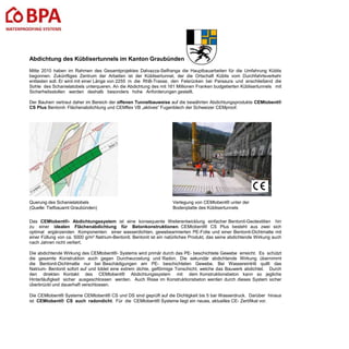 Das Dokument beschreibt die Anwendung des cemtobent® cs Abdichtungssystems im Tunnel- und Ingenieurbau, insbesondere im Zusammenhang mit dem Küblisertunnel und dem Bahnhof Löwenstrasse in Zürich, wo hohe Anforderungen an die Dichtheit und Langlebigkeit gestellt werden. Das System, bestehend aus einer gewebearmierten PE-Folie und einer Bentonit-Dichtmatte, bietet zuverlässigen Schutz gegen Wasser und hat sich in mehreren Projekten bewährt, auch aufgrund seiner Wirksamkeit gegen Radon und Wurzelwachstum. Es werden auch zusätzliche Abdichtungsmaßnahmen und die innovative Herangehensweise der bpa GmbH an komplexe Herausforderungen im Bereich der Wasserdichtheit von Betonbauwerken hervorgehoben.