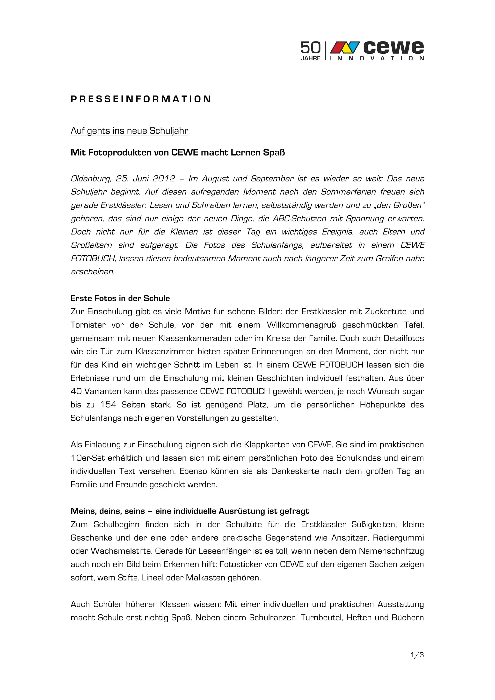 Die Presseinformation von Cewe informiert über den bevorstehenden Schulbeginn und die vielfältigen Fotoprodukte, die das Lernen und die Erinnerungen an diesen besonderen Tag unterstützen. Dazu gehören personalisierte Fotobücher, Klappkarten und verschiedene Schulartikel wie Trinkflaschen und Etuis, die mit Fotos gestaltet werden können. Cewe bietet eine breite Palette an Produkten, um die Erlebnisse der Einschulung individuell festzuhalten und den Schulalltag zu bereichern.