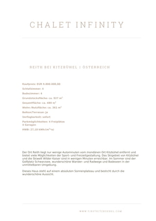 Das Dokument beschreibt den Verkauf eines luxuriösen Chalets in Reith bei Kitzbühel, Österreich, zum Preis von 9.800.000 Euro, mit 4 Schlafzimmern und 4 Badezimmern auf einer Grundstücksfläche von etwa 927 m². Die Immobilie bietet zahlreiche Annehmlichkeiten, darunter einen Infinity-Pool, eine Wellness- und Fitnessanlage sowie einen Weinkeller, und liegt in unmittelbarer Nähe zu Sport- und Freizeitmöglichkeiten sowie Skigebieten. Es enthält auch Informationen über anfallende Nebenkosten und rechtliche Hinweise bezüglich des Immobilienkaufs in Österreich.