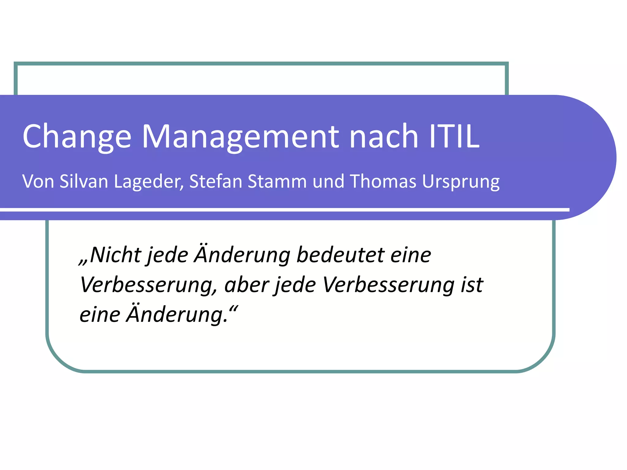 Das Dokument beschreibt Change Management gemäß ITIL, betont die Bedeutung systematischer Prozesse zur erfolgreichen Umsetzung von Änderungen in Organisationen und definiert Ziele, Aktivitäten sowie Rollen im Change Management. Es behandelt wichtige Aspekte wie das Einbinden in ITIL, die Notwendigkeit von Kontrolle über Veränderungen und die Herausforderungen, die bei der Umsetzung auftreten können. Zudem wird die Rolle des Change Advisory Boards (CAB) hervorgehoben und es werden Key Performance Indicators (KPIs) zur Messung des Erfolgs im Change Management vorgestellt.