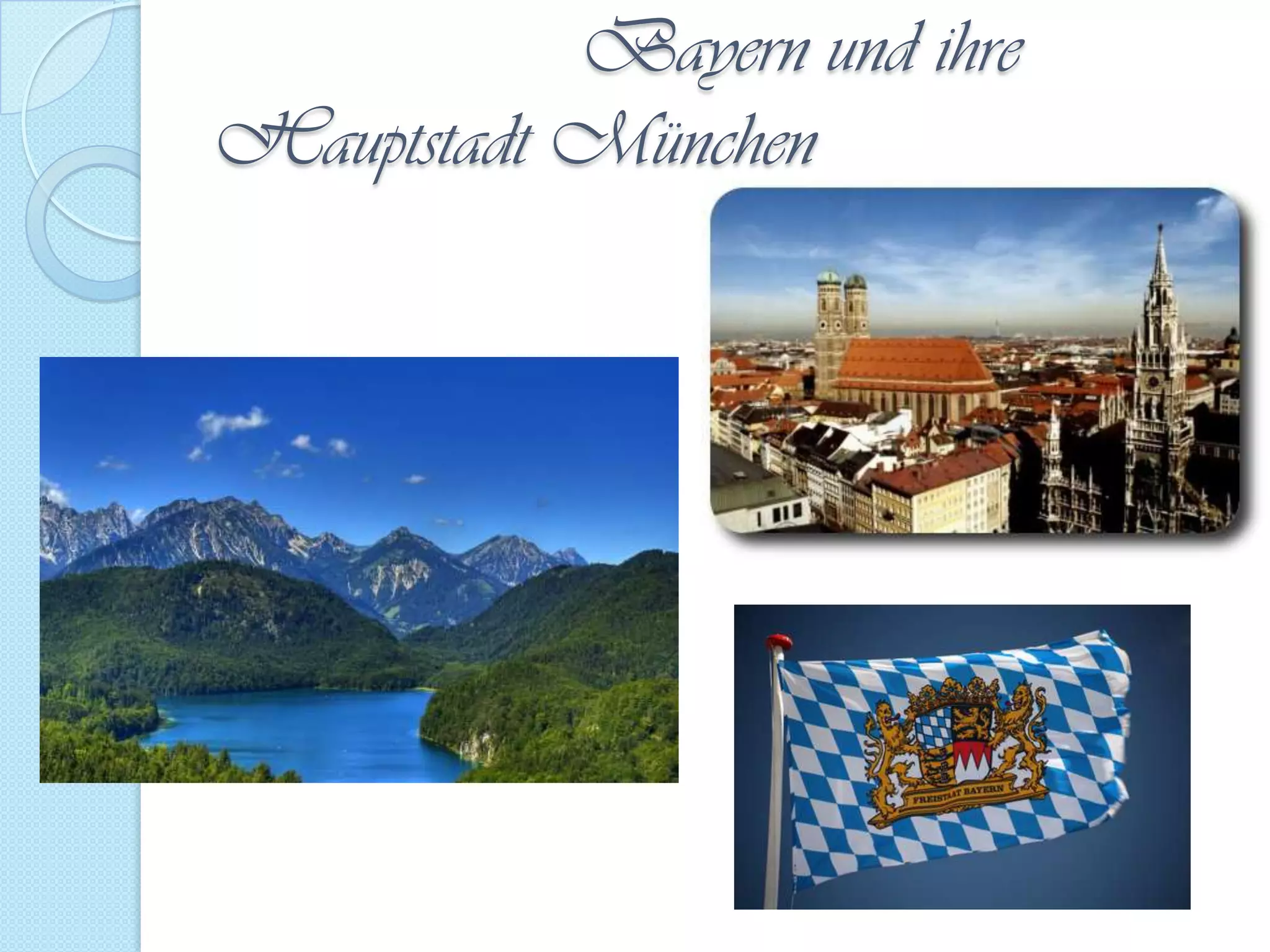 Das Dokument beschreibt Bayern und die Hauptstadt München, einschließlich Sehenswürdigkeiten wie dem Marienplatz, dem Glockenspiel, dem Neuen Rathaus und der Frauenkirche. Es enthält Informationen über Museen wie die Alte, Moderne und Neue Pinakothek sowie über das Schloss Nymphenburg, den Englischen Garten, den Olympiapark und die Olympiaturm. Zudem wird der BMW und die Tracht erwähnt.