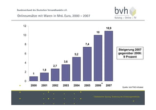 Der Bundesverband des Deutschen Versandhandels e.V. stellte auf einer Pressekonferenz am 29. Oktober 2007 die Entwicklung des E-Commerce in Deutschland vor. Die Onlineumsätze mit Waren verzeichneten einen Anstieg von 9 Prozent im Jahr 2007 im Vergleich zu 2006, wobei die Umsätze in Milliarden Euro von 2000 bis 2007 dargestellt wurden. Diese Kennzahlen deuten auf ein kontinuierliches Wachstum im deutschen Online-Handel hin.