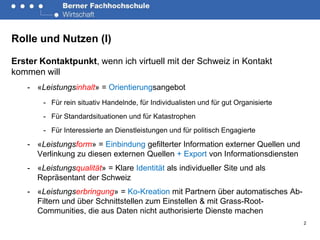 Das Dokument beschreibt die Rolle und Nutzen des E-Government in der Schweiz, insbesondere die Bedeutung digitaler Plattformen als erste Kontaktpunkte für Bürger und die Ko-Kreation von Dienstleistungen mithilfe externer Datenquellen. Es betont die Wichtigkeit einer benutzerzentrierten Architektur sowie langfristiges Beziehungsmanagement und technologische Verbesserungen. Zudem wird auf die Notwendigkeit einer Roadmap zur Koordination mit anderen Akteuren hingewiesen, um die Effizienz und Effektivität der Verwaltungsstrukturen zu steigern.