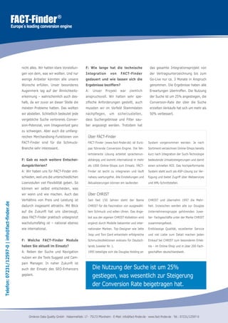 Christ hat von einer Open-Source-Suchlösung auf Fact-Finder umgestellt, was zu einer 25%igen Steigerung der Suchnutzung und über 50% mehr suchgenerierten Verkäufen führte. Christine Wurm, Leiterin E-Commerce, betont, dass die neue Lösung relevante Ergebnisse liefern und ein positives Einkaufserlebnis garantieren sollte. Die Integration von Fact-Finder dauerte nur etwa drei Monate und übertraf die Erwartungen des Unternehmens.