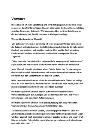 Der Kleingartenverein 'Kirchenland' e.V. in Bernau wurde 1923 gegründet und hat eine Chronik, die kontinuierlich ergänzt wird, um die Geschichte des Vereins festzuhalten. Die Chronik dokumentiert die Entwicklung des Vereins, die Herausforderungen im Pachtwesen sowie die gesellschaftlichen Aktivitäten innerhalb der Gemeinschaft. Die Ereignisse und Protokolle von 1923 bis 1988 zeigen die Bedeutung des Gartens als Rückzugsort und die evolutionären Veränderungen im Vereinsleben über die Jahrzehnte.