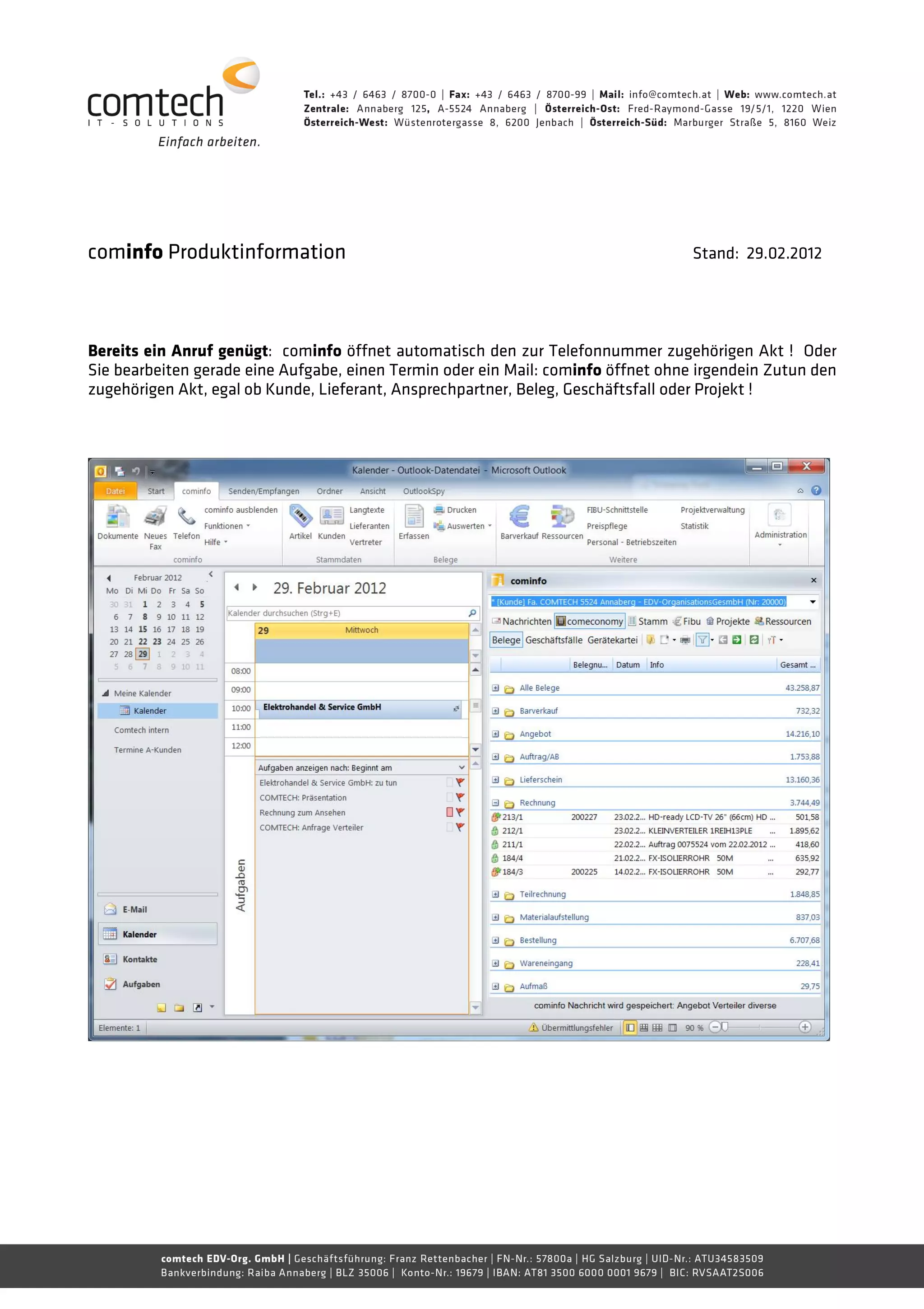 Cominfo ist eine integrierte Softwarelösung, die eine umfassende Übersicht über Informationen zu Kunden, Lieferanten und Geschäftsprozessen bietet und in Outlook eingebettet ist. Das System ermöglicht einen schnellen Zugriff auf relevante Daten und verbessert das Kontaktmanagement, die Auftragsverwaltung und das Marketing durch eine zentrale und modulare Datenstruktur. Durch eine benutzerfreundliche Navigation und automatische Verknüpfungen werden langwierige Suchprozesse minimiert und die Effizienz in der Projektbearbeitung gesteigert.