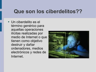 Este documento describe diferentes tipos de ciberdelitos como el spam, fraude, contenido obsceno u ofensivo, hostigamiento y acoso, tráfico de drogas, y terrorismo virtual. También presenta dos casos de estafas realizadas a través de Internet, incluyendo una estafa bancaria y una estafa sobre un supuesto remedio para curar el SIDA.