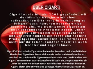Cigarti, gegründet 2009, bietet eine innovative alternative zu traditionellen Zigaretten mit elektronischen Zigaretten, die echten Zigaretten ähneln und nikotinhaltigen Wasserdampf produzieren. Das Unternehmen setzt auf hohe Produktqualität, Integrität und kreative Lösungen zur Verbesserung des Nutzererlebnisses sowie zur Schaffung von Werten für Investoren. Mit einem breiten Sortiment an Geschmacksrichtungen und einem Fokus auf Kundenbedürfnisse will Cigarti die Erwartungen der Verbraucher übertreffen und gleichzeitig verantwortungsbewusst in den Gemeinschaften, in denen sie tätig sind, handeln.