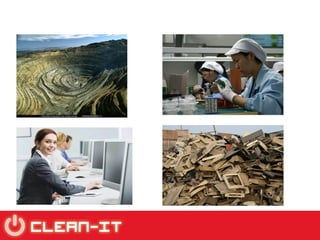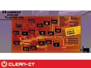 Das Dokument beschreibt die globale Wertschöpfungskette eines PCs, einschließlich der umweltschädlichen und gesundheitlichen Auswirkungen des Rohstoffabbaus und der Produktion, die oft unter schlechten Arbeitsbedingungen erfolgt. Dabei wird auf die große Menge an benötigten Rohstoffen hingewiesen, insbesondere Metalle, und die Problematik der E-Waste-Entsorgung. Die Kampagne 'Clean IT' zielt darauf ab, das Bewusstsein für diese Probleme zu schärfen und soziale sowie ökologische Standards in der Beschaffung von Computern zu fördern.