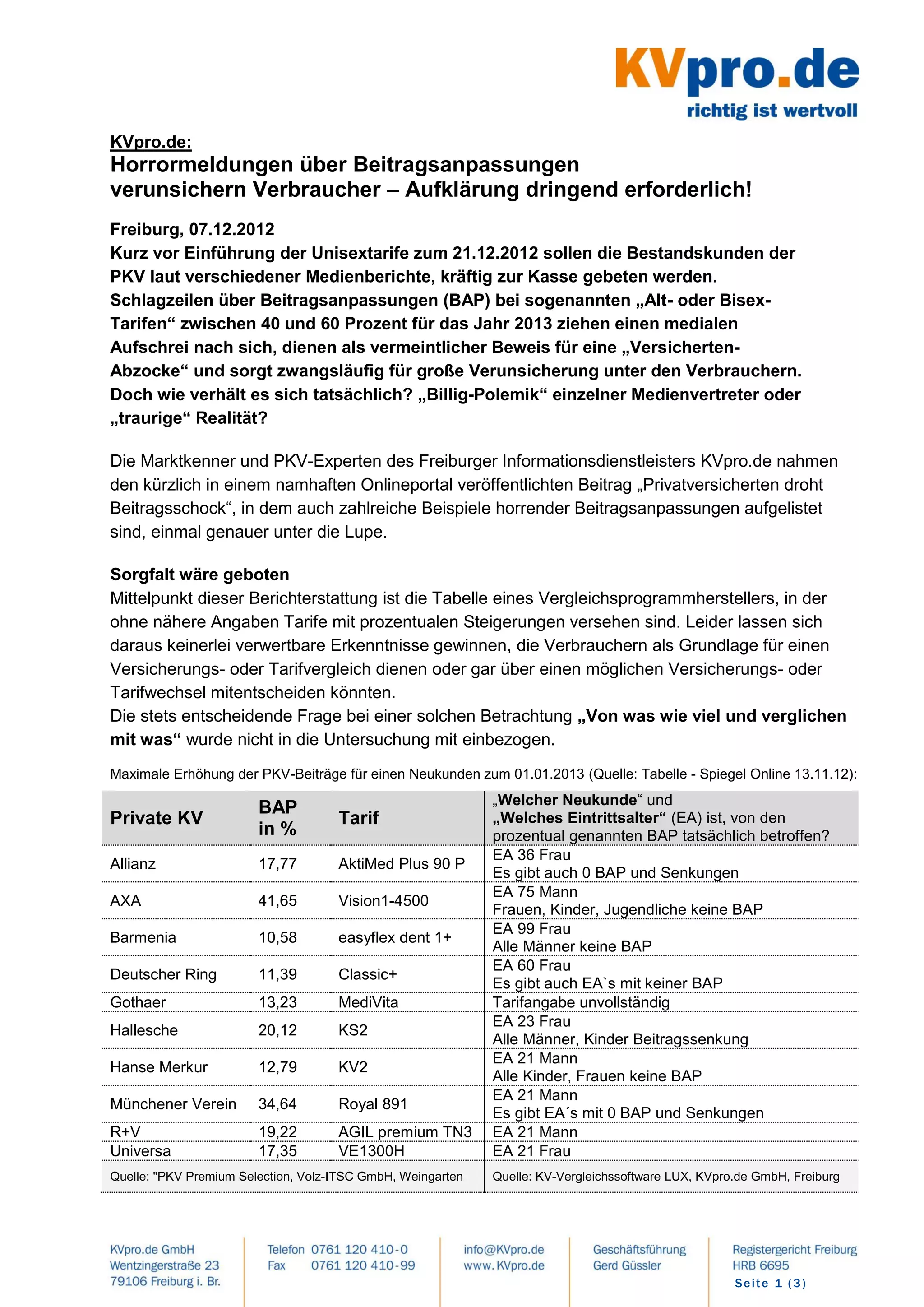 Die Medienberichte über massive Beitragserhöhungen in der privaten Krankenversicherung (PKV) verunsichern Verbraucher und geben Anlass zur Sorge. Der Freiburger Informationsdienstleister kvpro.de kritisiert, dass pauschale Aussagen über Beitragsanpassungen irreführend sind, da jede Anpassung von verschiedenen Faktoren abhängt und individuelle Tarife sowie Altersgruppen betrachtet werden müssen. Auch die Medien sollten künftig genauer informieren und konkrete Eurobeträge statt Prozentwerte verwenden, um die Verbraucher besser aufzuklären.