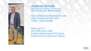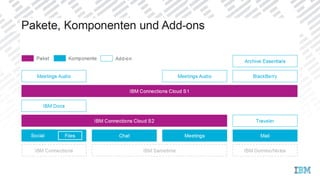 Das Dokument beschreibt die Cloud-Updates von IBM aus dem Jahr 2016 und präsentiert verschiedene Angebote wie Infrastructure as a Service und Software as a Service. Es betont die Bedeutung einer integrierten Plattform für Zusammenarbeit und Dokumentenmanagement sowie die Flexibilität der Client-Optionen für E-Mail und Anwendungen. Zudem wird auf die kontinuierliche Entwicklung und die bevorstehenden Updates von IBM-Produkten hingewiesen, die jederzeit Änderungen unterliegen können.