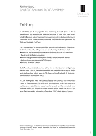 Das Dokument beschreibt die Entwicklung eines cloud-basierten ERP-Systems für die Swiss Break Group AG durch Wolter & Works, das 2006 begann und eine tcpos-Schnittstelle umfasst. Es erfüllt Anforderungen wie die Verwaltung von Franchisenehmern, eine Immobilien-Datenbank, Personalplanung und Umsatzauswertung und ermöglicht den Franchisenehmern, Daten live abzurufen. Wolter & Works betont die enge Zusammenarbeit mit Kunden und bietet eine transparente Projektverwaltung sowie Unterstützung bei Marketingmaterialien.