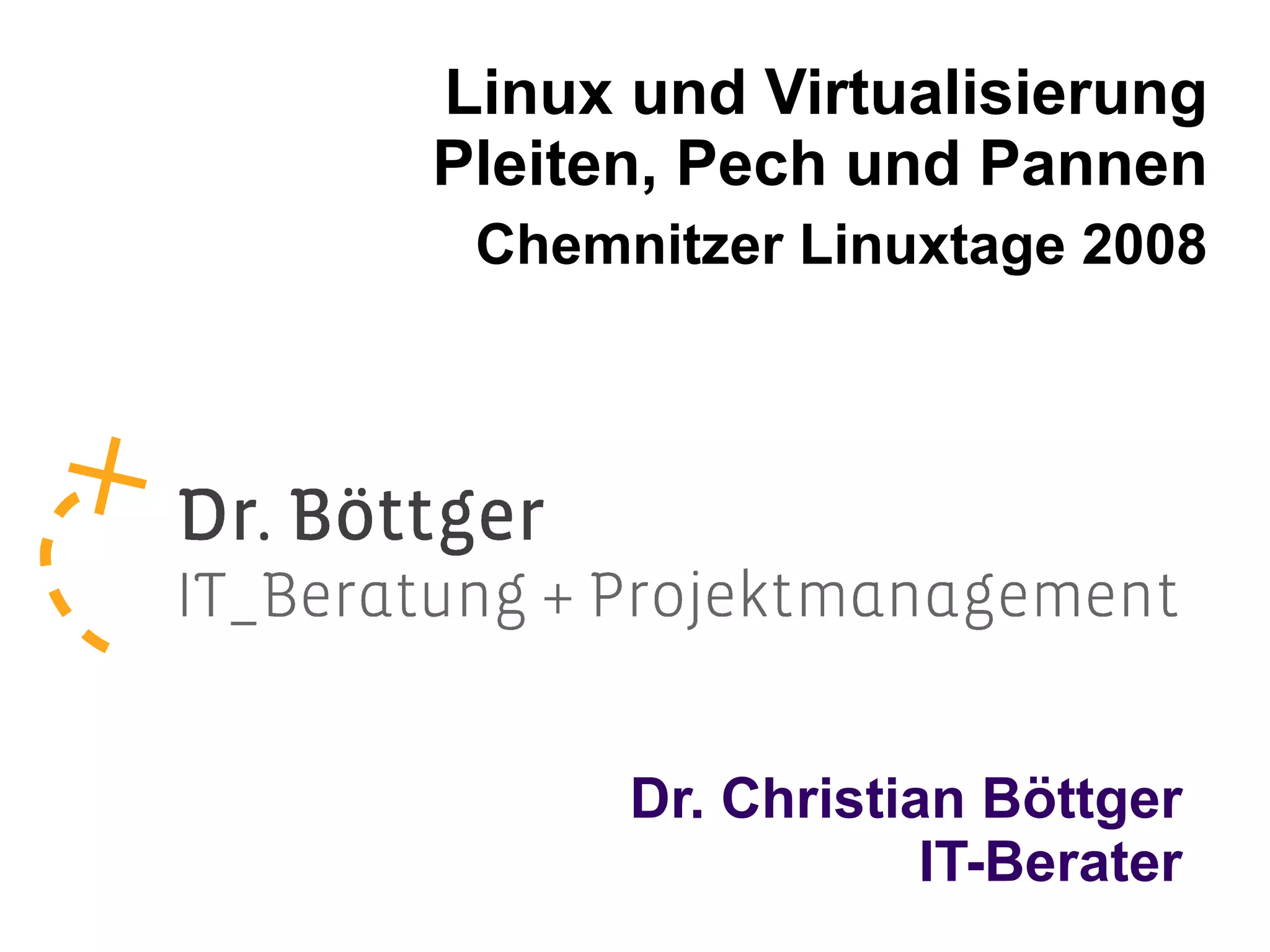 Das Dokument behandelt die Herausforderungen und Pannen im Bereich der Virtualisierung unter Linux, präsentiert von Dr. Christian Böttger auf den Chemnitzer Linuxtagen 2008. Es werden verschiedene Virtualisierungstechniken und deren Vor- und Nachteile diskutiert, sowie spezifische Probleme beispielsweise mit Xen, VMware, QEMU und Bochs aufgezeigt. Die Präsentation schließt mit dem Fazit, dass keine der Lösungen perfekt ist und gute Planung essentiell ist, um die Anforderungen zu erfüllen.