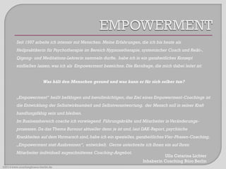 Das Coaching Büro Berlin, geleitet von Ulla Catarina Lichter, bietet seit 1997 ganzheitliche Coaching-Dienstleistungen an, die sich auf Empowerment, Selbstverantwortung und Stressmanagement fokussieren. Besonders im Kontext von Führungsverantwortung und der Bewältigung von Burnout-Symptomen werden individuelle Coaching-Programme angeboten, die auf die spezifischen Bedürfnisse der Mitarbeiter abgestimmt sind. Zusätzliche Angebote umfassen Empowerment-Auszeiten an verschiedenen Orten zur Förderung von Gesundheit und Resilienz.