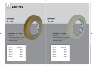 Das Dokument beschreibt verschiedene Produkte und Techniken zum Abkleben und Schleifen in der Lackierung, einschließlich hitzebeständiger Klebebänder, Abdeckpapier, Schleifmittel und persönliche Schutzausrüstung. Es bietet detaillierte Informationen zu Materialien, Anwendungen und Spezifikationen, um optimale Lackierergebnisse zu gewährleisten. Zudem werden Produktnummern und Eigenschaften von Abdeck- und Schleifmaterialien aufgelistet.