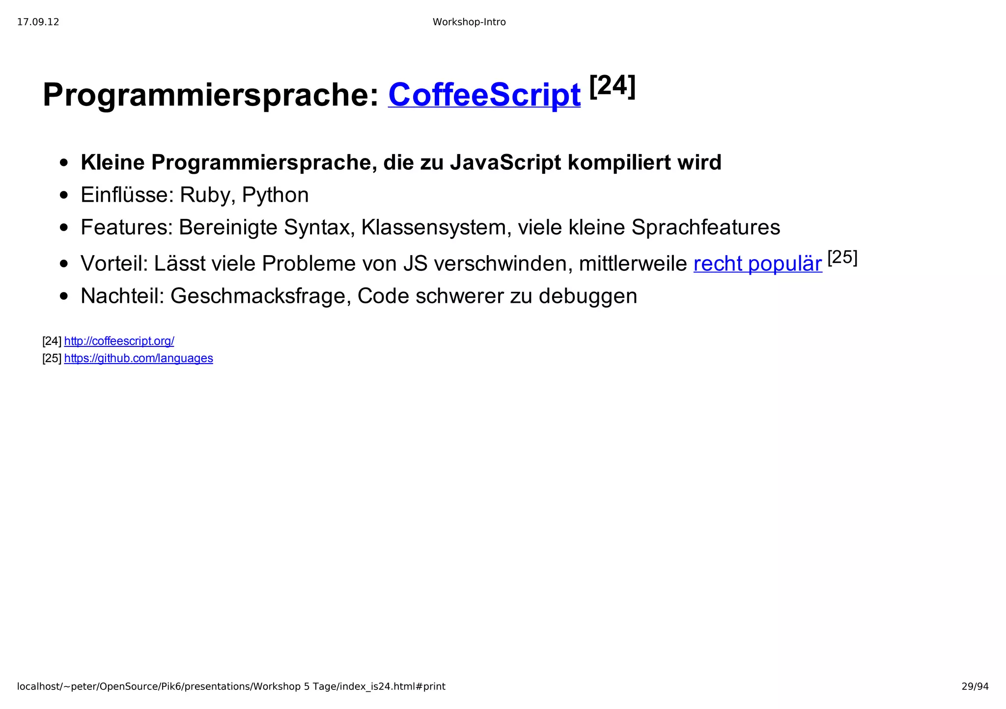 Das Dokument beschreibt Workshops zur Programmiersprache CoffeeScript und zur Architektur von Backbone.js. CoffeeScript ist eine kleine Sprache, die zu JavaScript kompiliert wird und sich durch eine bereinigte Syntax und ein klassensystem auszeichnet, während Backbone.js clientseitige MVC-Komponenten bereitstellt. Insgesamt bietet das Dokument einen Überblick über Vor- und Nachteile von CoffeeScript sowie die Nutzung von Backbone.js und deren Klassenstrukturen.