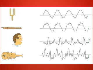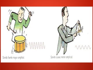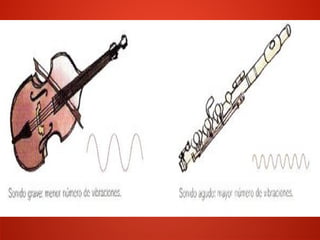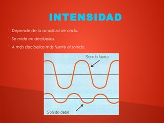 Este documento describe las cuatro cualidades del sonido: intensidad, duración, altura y timbre. La intensidad depende de la amplitud de la onda y se mide en decibelios. La duración depende de la persistencia de la onda y se mide en segundos. La altura depende de la frecuencia de la onda y se mide en hertzios. El timbre depende de los armónicos de la onda y da forma característica a cada voz y instrumento.