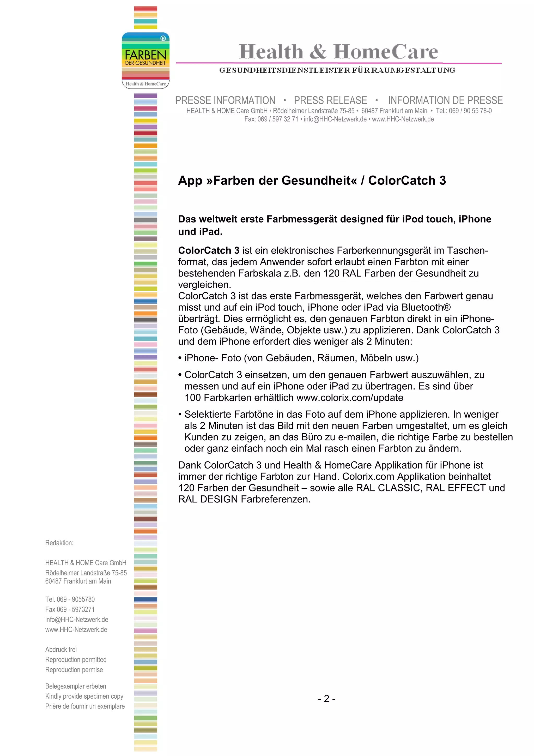 Colorcatch 3 ist das weltweit erste Farbmessgerät speziell für iPod Touch, iPhone und iPad, das es Nutzern ermöglicht, Farbtöne schnell zu messen und auf Fotos anzuwenden. Innerhalb von weniger als zwei Minuten können Nutzer den genauen Farbwert auswählen, messen und den neuen Farbton direkt in ein iPhone-Foto integrieren. Die App "Farben der Gesundheit" bietet über 100 Farbkarten einschließlich der RAL-Farben.