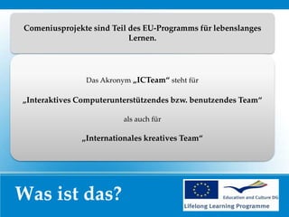 Das Comenius-Projekt 'icteam' von 2013 bis 2015, gefördert durch das EU-Programm für lebenslanges Lernen, brachte Schüler und Lehrer von Schulen aus mehreren europäischen Städten zusammen, um durch virtuelle Zusammenarbeit und Meetings interkulturelle Erfahrungen auszutauschen. Höhepunkte des Projekts waren Workshops, Unterrichtsbesuche und Stadtführungen in Wetzlar, die den Teilnehmern Einblicke in verschiedene Bildungsansätze und lokale Kultur boten. Das Projekt wurde durch die Unterstützung zahlreicher Lehrkräfte und Schüler ermöglicht.