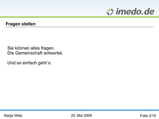 Das Dokument beschreibt die Funktionen und Abläufe der Gemeinschaftsfragen auf der Plattform imedo.de, wo Mitglieder Fragen stellen und beantworten können. Es erläutert, wie Benutzer ihre Fragen posten, Antworten geben und Fragen abonnieren können, um über neue Antworten informiert zu werden. Zudem werden Kategorien angezeigt, um die gesammelten Fragen besser zu strukturieren und zu finden.