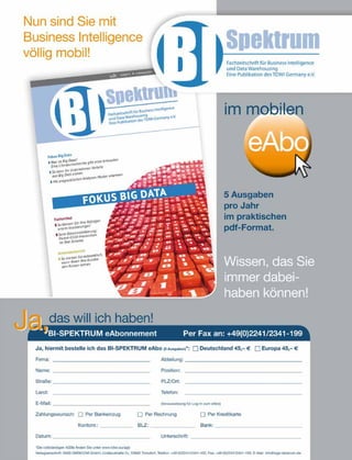 Das Dokument diskutiert die aktuellen Herausforderungen und Chancen in der Business Intelligence (BI) durch Consumerization, Agilität und Big Data, die bestehende BI-Strategien in Frage stellen. Es hebt die Notwendigkeit hervor, neue Datenanalysestrategien zu entwickeln und betont die steigende Bedeutung von Daten als strategisches Wirtschaftsgut für den Unternehmenserfolg. Der BARC BI Congress bietet Unternehmen Orientierung und Best Practices, um in der dynamischen BI-Landschaft innovativ zu bleiben.