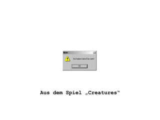 Das Dokument beleuchtet humorvoll die skurrilen Aspekte der Computer- und Programmierwelt, insbesondere im Zusammenhang mit Software-Entwicklung und Benutzererfahrung. Es thematisiert die Vereinfachungen von Microsofts neuen Office-Paket und spricht verschiedene abwegige Gedanken und Situationen auf, die Programmierer möglicherweise durchleben. Neben technischen Fragen und Anekdoten wird auf die Herausforderungen und Absurditäten in der Programmierung hingewiesen.
