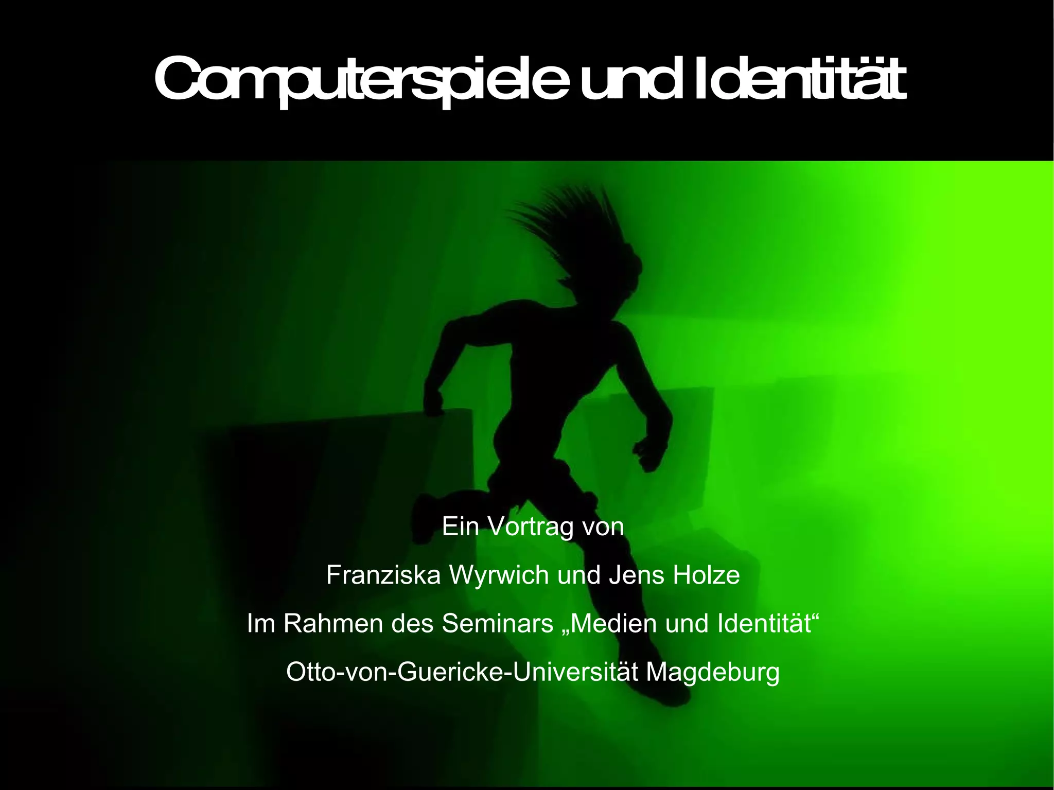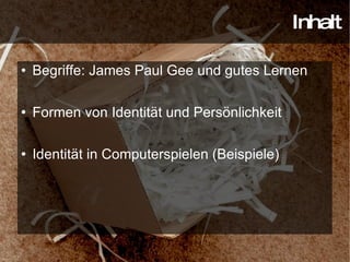 Der Vortrag von Franziska Wyrwich und Jens Holze beleuchtet die Rolle von Computerspielen in der Identitätsbildung und -reflexion, anhand von Konzepten wie semiotischen Domänen und den verschiedenen Identitäten (projektive, virtuelle und reale Identität). Beispielhafte Spiele wie 'Die Sims 2' und 'Zelda: Twilight Princess' verdeutlichen, wie Spieler mit ihren Charakteren interagieren und dabei Erfahrungen zu ihrer eigenen Identität sowie zu Empathie für andere entwickeln. Computerspiele bieten somit eine Möglichkeit für aktives und kritisches Lernen, das zu einer veränderten Weltsicht führen kann.