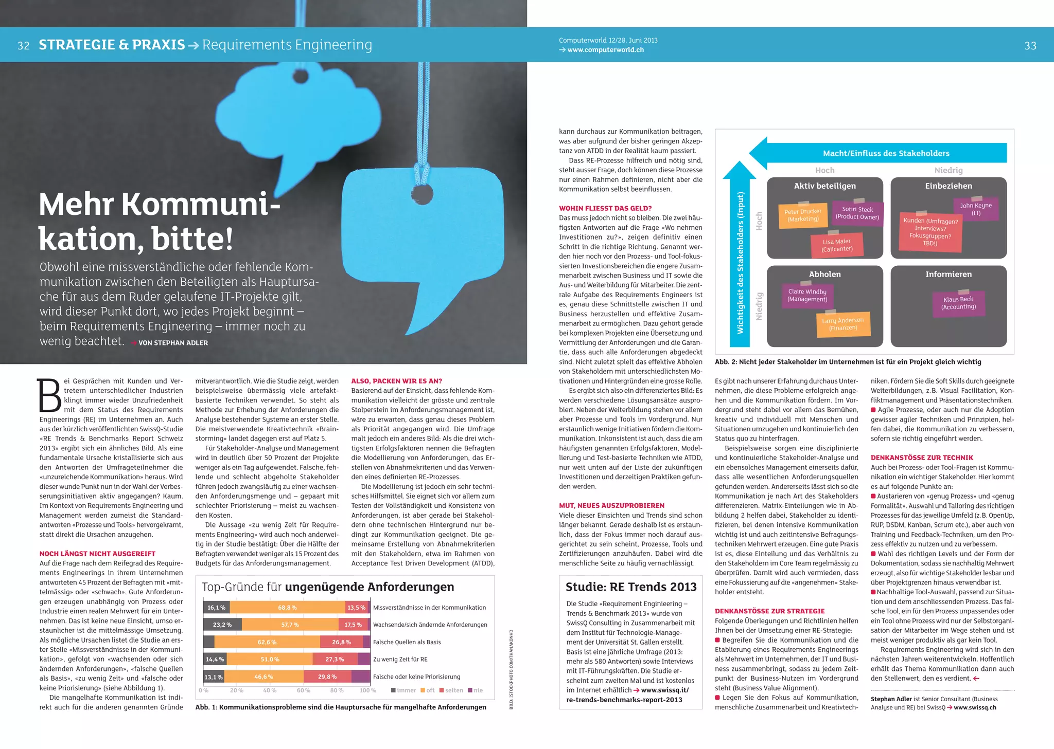 Das Dokument behandelt die Herausforderungen und Verbesserungsmöglichkeiten im Bereich Requirements Engineering, wobei unzureichende Kommunikation als Hauptursache für gescheiterte IT-Projekte identifiziert wird. Eine disziplinierte Stakeholder-Analyse und das gezielte Management von Anforderungen werden als essentielle Strategien hervorgehoben, um effektive Kommunikation und Zusammenarbeit zwischen IT und Business zu fördern. Die Studie empfiehlt, Soft Skills der Mitarbeitenden zu stärken und innovative Ansätze anstelle traditioneller Prozesse und Tools zu verfolgen.