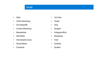 Das Dokument behandelt die Grundlagen des Online-Marketings, insbesondere Content Marketing und Social Media, sowie deren Bedeutung für die Customer Journey und die Messbarkeit von Marketingstrategien. Es bietet eine detaillierte Analyse der verschiedenen Social Media-Plattformen wie Facebook, YouTube und Twitter, inklusive deren Vor- und Nachteile und gibt praktische Empfehlungen für deren Nutzung. Zudem wird die Wichtigkeit von SEO/SEM und modernen Web-Präsentationen hervorgehoben, um die Sichtbarkeit und Interaktivität im digitalen Raum zu verbessern.