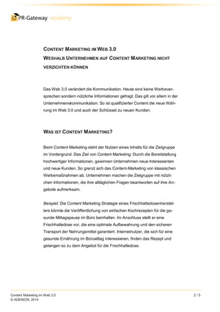 Content Marketing ist im Web 3.0 von zentraler Bedeutung, da Unternehmen durch nützliche Informationen Vertrauen aufbauen und neue Kunden gewinnen können. Hochwertige Inhalte, die den Interessen der Zielgruppe entsprechen, sind entscheidend, um sich von der Konkurrenz abzuheben. Die Sichtbarkeit dieser Inhalte in Suchmaschinen ist essenziell, weshalb die Verbreitung über Online-Pressemitteilungen auf verschiedenen Plattformen empfohlen wird.