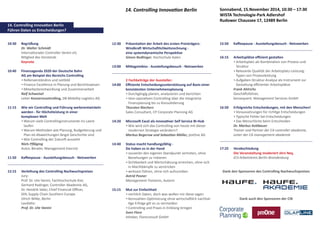Die Veranstaltung 'Controlling Innovation Berlin' findet am 15. November 2014 im WISTA Technologie-Park Adlershof statt und behandelt aktuelle Entwicklungen im Controlling. Die Teilnahmegebühr beträgt 200 € für Mitglieder und 250 € für Nichtmitglieder, mit Ermäßigungen für Studenten und Arbeitslose, und die Anreise ist sowohl mit PKW als auch mit öffentlichen Verkehrsmitteln möglich. Die Veranstaltung bietet mehrere Vorträge und Podiumsdiskussionen zu Themen wie Finanzplanung, Datennutzung und Entscheidungsfindung.
