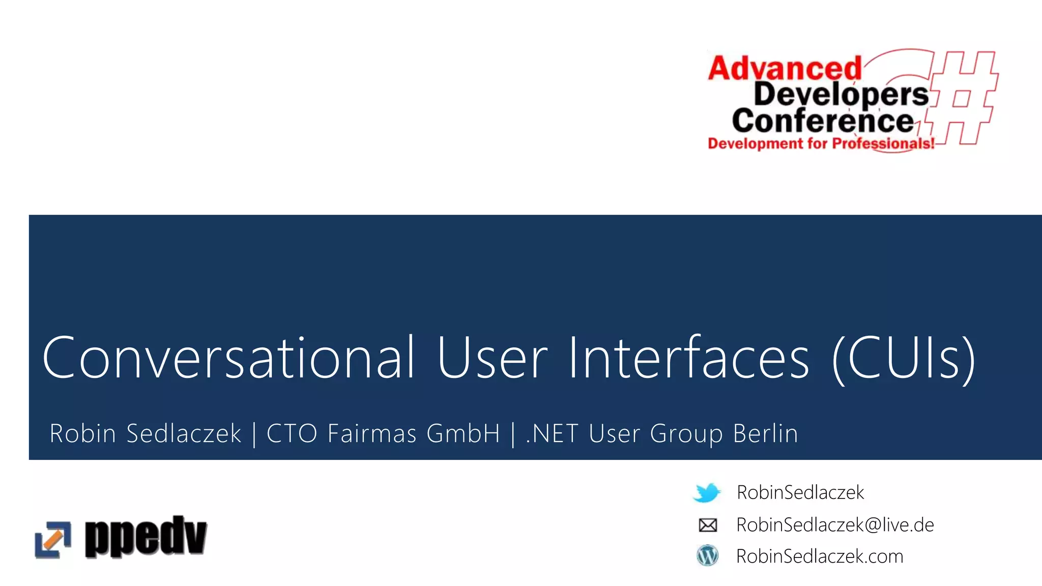 Robin Sedlaczek ist der CTO der Fairmas GmbH in Berlin und ein aktiver Community-Leader sowie Blogger im Bereich .NET-Entwicklung. Das Dokument beleuchtet die Evolution von Benutzeroberflächen von 1884 bis heute und thematisiert insbesondere den Einfluss konversationaler Benutzeroberflächen und Bots, die in den nächsten 20 Jahren einen signifikanten Teil der Arbeitsplätze in den USA ersetzen könnten. Sedlaczek zeichnet sich durch seine Beiträge in Fachzeitschriften und Open-Source-Projekten aus.