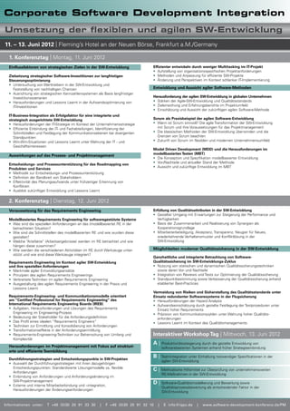 Die Konferenz zur agilen Softwareentwicklung fand vom 11. bis 13. Juni 2012 in Frankfurt statt und befasste sich mit den Herausforderungen und Best Practices der Softwareentwicklung in Unternehmen. Themen umfassten die Integration von Softwarelösungen, risikomindernde Maßnahmen zur Qualitätssicherung sowie agile Methoden und deren Umsetzung in verschiedenen Kontexten. Es wurden zahlreiche Workshops angeboten, um den Teilnehmern praktische Fähigkeiten in der Softwareentwicklung zu vermitteln.