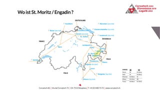 Das Dokument beschreibt die verschiedenen Attraktionen und Angebote im Engadin, insbesondere in St. Moritz und der Umgebung, einschließlich Ski- und Gourmet-Erlebnissen sowie Wellnessmöglichkeiten. Es hebt die atemberaubende Natur und die exklusive Ski-Destination hervor und informiert über die Erreichbarkeit und Einrichtungen der Region. Zudem wird auf die Möglichkeit von Events und Feiern in bergigen Locations eingegangen.