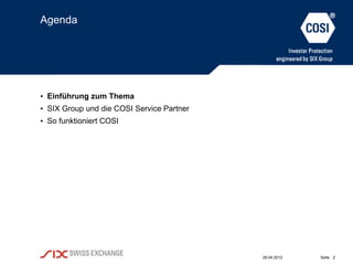 Das Dokument beschreibt das cosi®-Produkt, ein besichertes Finanzinstrument, das Anlegern hilft, das Ausfallrisiko von Emittenten zu minimieren, indem Sicherheiten hinterlegt werden. Die rechtlichen Grundlagen, die Rolle der SIX Group, akzeptierte Sicherheiten sowie die Funktionsweise und relevanten Risiken von cosi werden erläutert. Auch die Bedingungen und Kosten der Besicherung sowie die Vorgehensweise im Fall von Sicherheitenverwertung werden angesprochen.