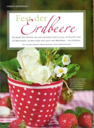Das Dokument beschreibt das dänische Familienhaus von Tine und Michael Fuglsang, das durch klare Strukturen und eine stilvolle Mischung aus skandinavischem Design und orientalischen Akzenten besticht. Es werden auch die harmonische, lichtdurchflutete Inneneinrichtung sowie die Vorliebe der Familie für Ordnung und Ästhetik hervorgehoben. Darüber hinaus finden sich inspirationsreiche Ideen für die Gestaltung von Kaffeetischen und Blumenschmuck mit regionalen Erzeugnissen.