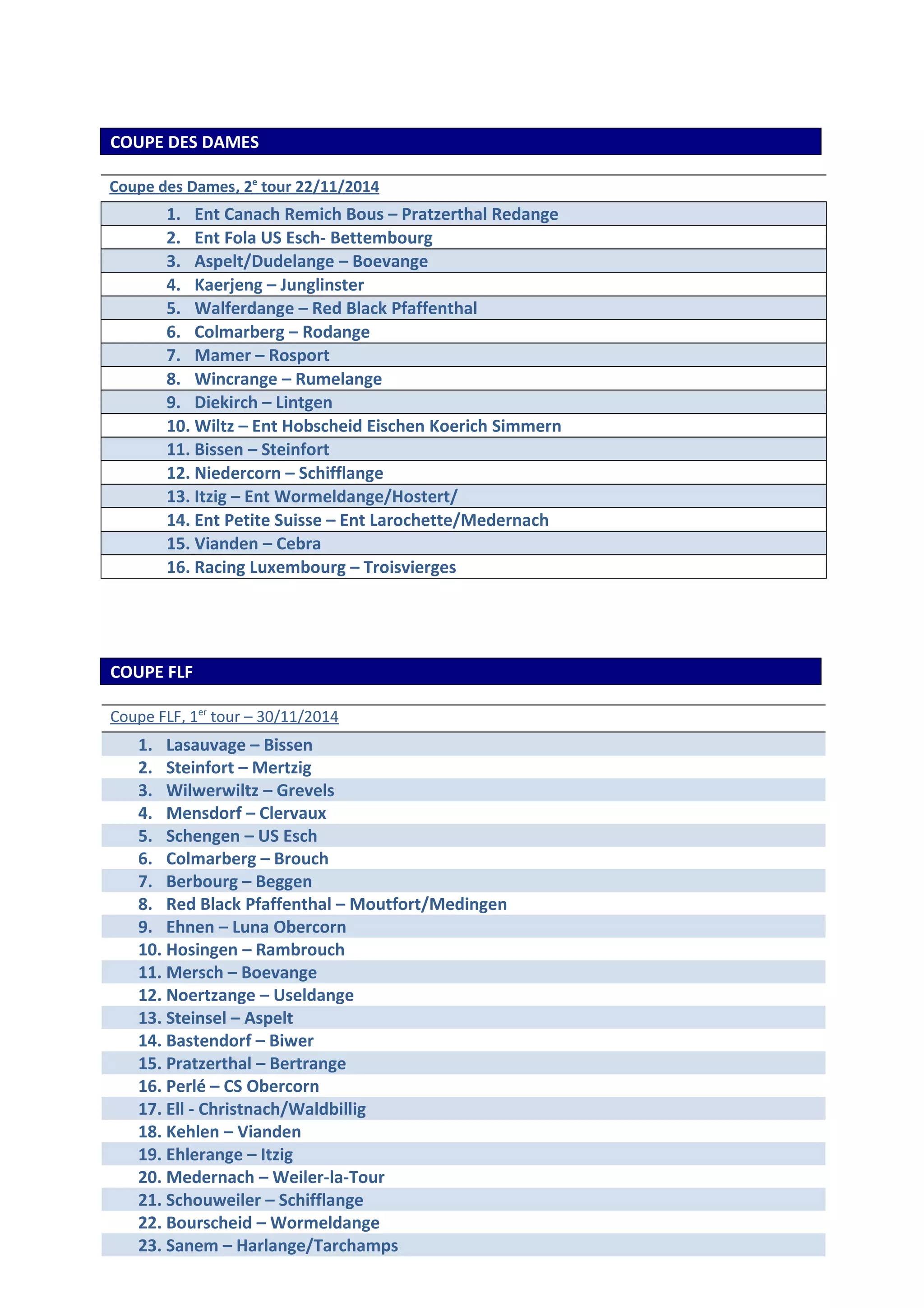 Das Dokument listet die Paarungen für die "Coupe des Dames" und die "Coupe FLF" im Fußball mit Daten und beteiligten Teams. Die "Coupe des Dames" findet am 22. November 2014 statt, während die "Coupe FLF" für den 30. November 2014 vorgesehen ist. Es werden insgesamt 31 Spiele in der "Coupe FLF" und 16 in der "Coupe des Dames" aufgeführt.