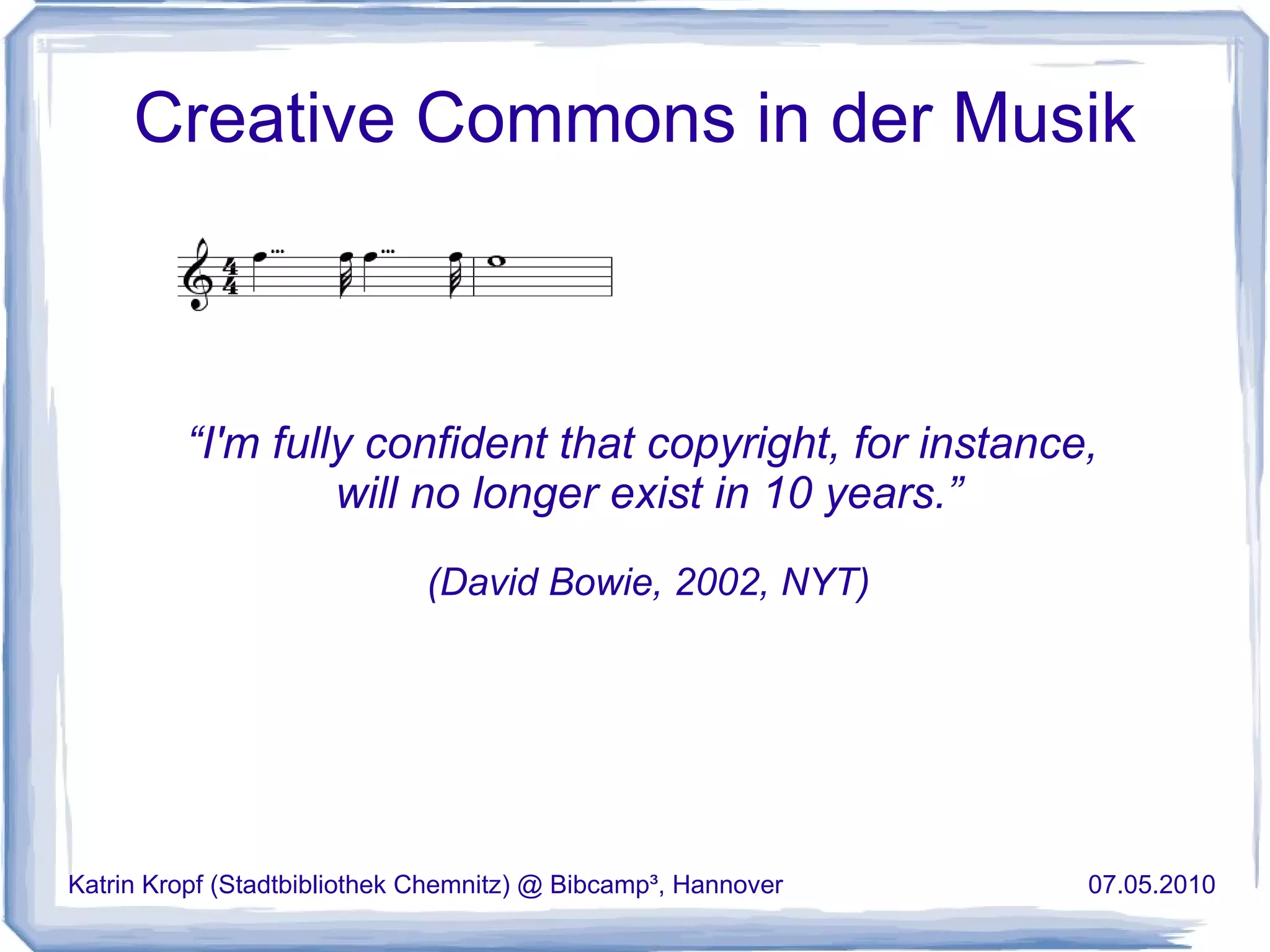 Das Dokument behandelt die Unterschiede zwischen Creative Commons und der GEMA im Kontext von Musikrechten und -lizenzierung. Es hebt hervor, dass Creative Commons eine nicht-reversible Freigabe von Werken beinhaltet, was für Künstler, die von ihrer Kreativität leben möchten, problematisch sein kann. Zudem wird die Rolle von Bibliotheken und die Unterstützung regionaler Künstler erwähnt, sowie die Möglichkeit, Creative Commons-lizenzierte Musik zu hosten und GEMA-Gebühren zu sparen.