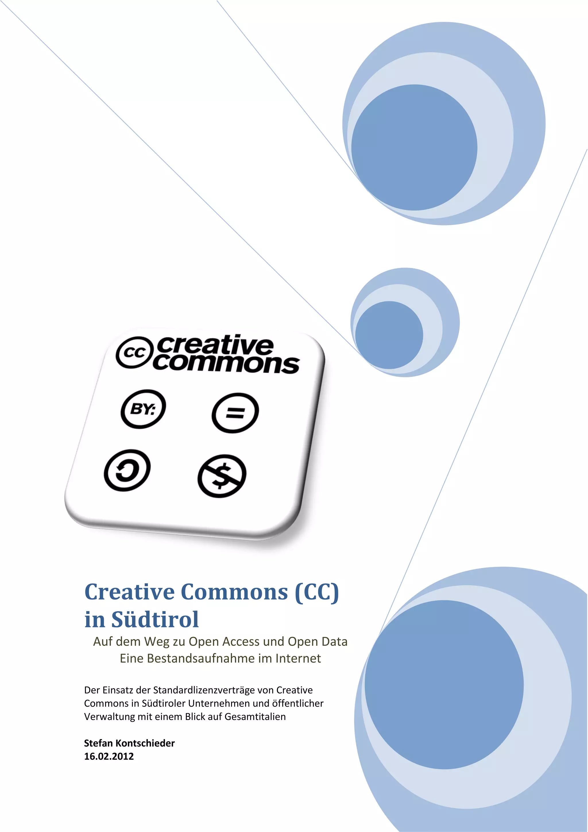 Das Dokument untersucht die Anwendung von Creative Commons-Lizenzen in Südtirol und Italien und hebt die Notwendigkeit neuer Lizenzierungsarten hervor, um den Zugang zu Informationen im Internet zu erleichtern. Während einige italienische öffentliche Verwaltungen Creative Commons-Lizenzen nutzen, ist der Einsatz in Südtirols privaten Unternehmen und der öffentlichen Verwaltung noch gering. Es wird ein Ausblick auf die zukünftige Rolle von Open Access und Open Data gegeben, um einen freien Zugang zu Wissen zu fördern.