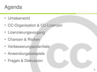 Das Dokument behandelt das Thema Urheberrecht und die Rolle der Creative Commons-Organisation, die rechtliche Möglichkeiten zum Teilen und Verändern von Inhalten bietet. Es wird auf die Vorteile und Herausforderungen von Creative Commons-Lizenzen eingegangen, einschließlich ihrer Flexibilität für Urheber und Benutzer sowie der Kritik an ihrer Wirksamkeit gegen Urheberrechtsverletzungen. Abschließend wird betont, dass die Chancen der Lizenzen die Risiken überwiegen, insbesondere mit Fokus auf die Aufklärung und Akzeptanz in der digitalen Gemeinschaft.