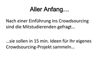Das Dokument beschreibt eine Schulung zum Thema Crowdsourcing in Non-Profit-Organisationen, bei der Studierende in kleinen Gruppen Ideen für eigene Projekte entwickeln. Dabei werden verschiedene Aspekte wie Zielgruppenansprache, klare Fragestellungen, Rechte an Ideen und Anreize berücksichtigt. Das Gewinnerprojekt, ein Crowdfunding für eine Bibliothek im Kinderspital, überzeugt durch Verständlichkeit und einen sozialen Zweck.