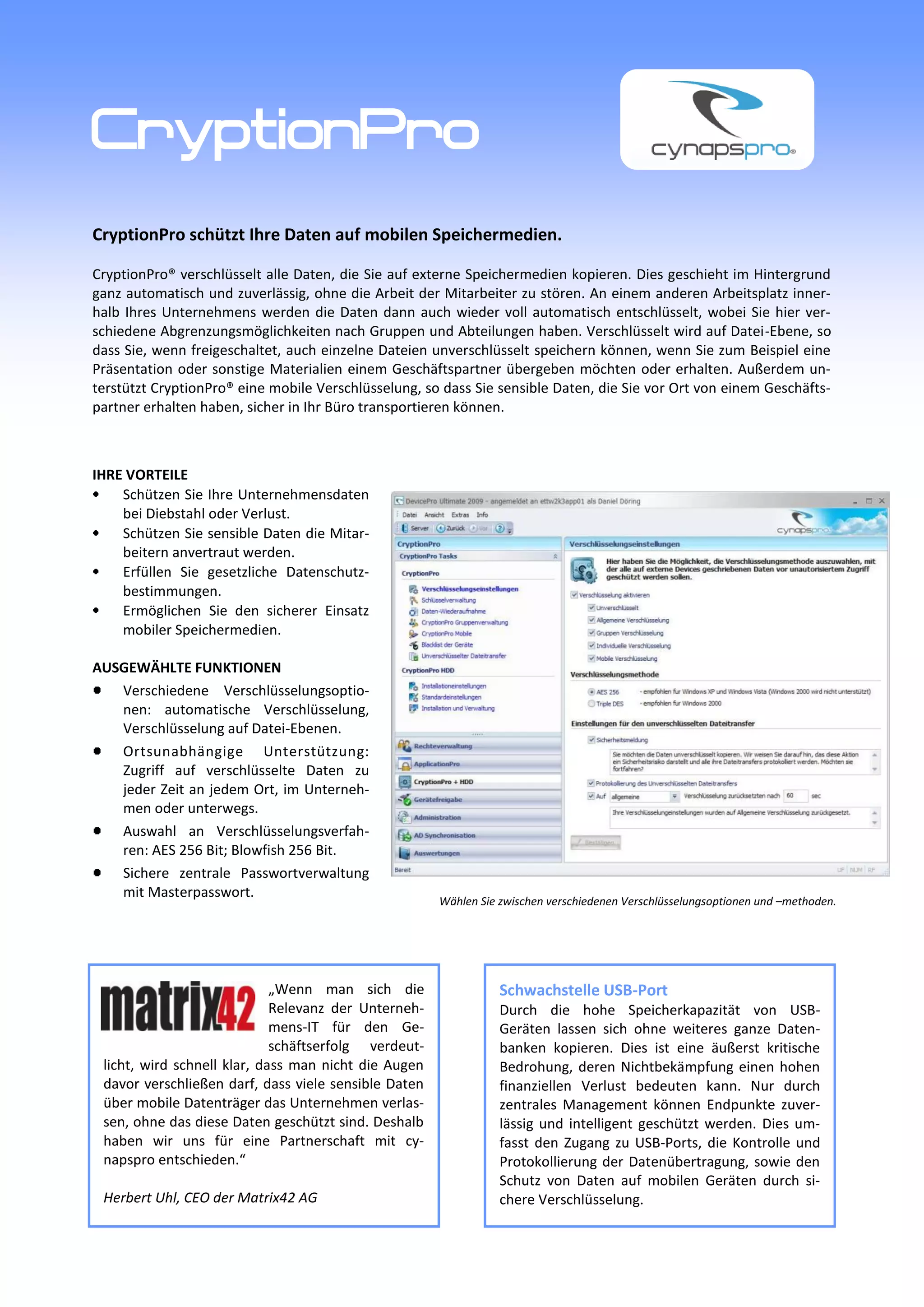 Cryptonpro schützt Unternehmensdaten auf mobilen Speichermedien durch automatische Verschlüsselung im Hintergrund, ohne die Arbeit der Mitarbeiter zu stören. Es bietet umfassende Funktionen zur Datenverschlüsselung, Verwaltung von Zugriffsrechten, sowie zentrale Passwortverwaltung, um sensible Informationen sowohl vor Diebstahl als auch vor Datenverlust zu schützen. Ergänzt wird es durch andere Lösungen von Cynapspro, die den Datenschutz an den Endpunkten verbessern und eine nahtlose Integration in bestehende Systeme ermöglichen.