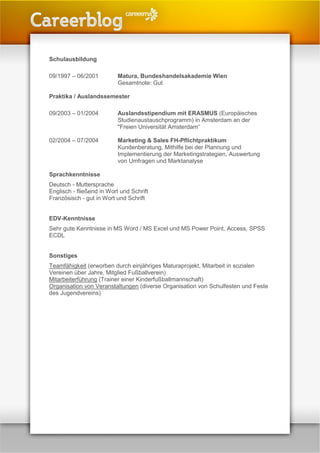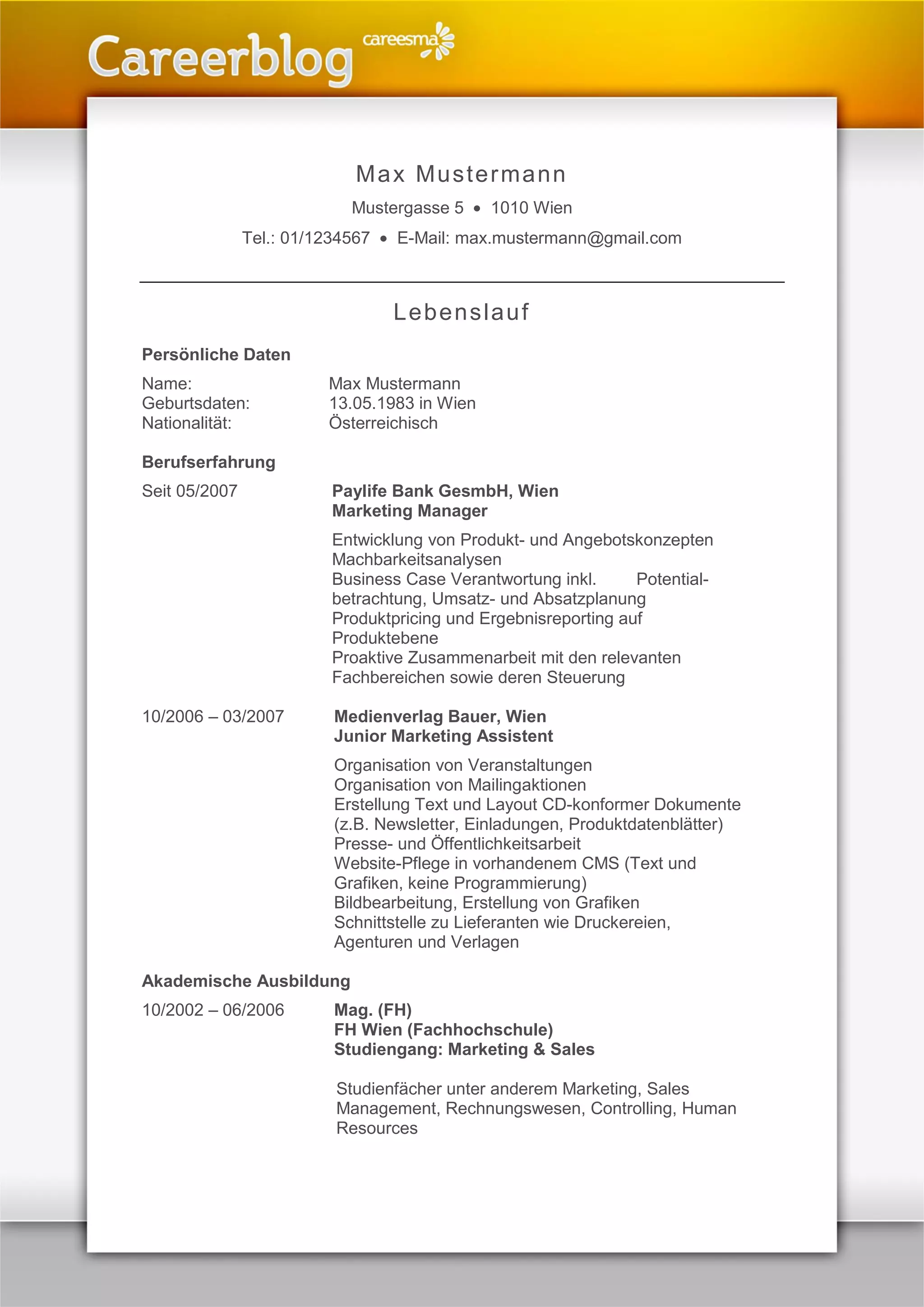 Max Mustermann, geboren am 13.05.1983 in Wien, ist ein erfahrener Marketing Manager bei Paylife Bank seit 2007 mit umfassender Erfahrung in Produktentwicklung und Marktanalysen. Zuvor arbeitete er als Junior Marketing Assistent bei Medienverlag Bauer und hat einen Magisterabschluss in Marketing & Sales von der FH Wien. Seine Sprachkenntnisse umfassen Deutsch, Englisch und Französisch, und er hat ausgeprägte EDV-Kenntnisse sowie Team- und Organisationsfähigkeiten.