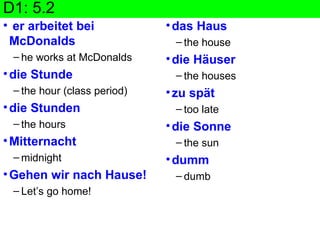 Das Dokument behandelt verschiedene Themen rund um Zeit und alltägliche Situationen, einschließlich des Sprechens über Uhrzeiten, den Besuch bei McDonald's und das Telefonieren. Es enthält auch Fragen zur Adresse und Telefonnummer sowie Informationen über die Schule und den Schulbeginn. Die Abschnitte sind in einfache Sätze unterteilt, die grundlegendes Vokabular und Phrasen vermitteln.