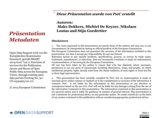 Dieses Dokument befasst sich mit der Qualität von offenen Daten und Metadaten, erläutert die verschiedenen Dimensionen der Datenqualität und beschreibt Best Practices zur Veröffentlichung hochwertiger offener Daten. Zentrale Aspekte sind Genauigkeit, Konsistenz, Verfügbarkeit, Vollständigkeit, Konformität, Glaubwürdigkeit, Verarbeitbarkeit, Relevanz und Aktualität der Daten. Außerdem wird betont, dass Metadaten eine entscheidende Rolle für die Qualität von Daten spielen.