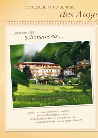 Das Dokument bietet eine umfassende Übersicht über verschiedene Urlaubsangebote und Aktivitäten in einer Naturumgebung, gegliedert nach den Jahreszeiten. Es beschreibt Erlebnisse wie Skifahren im Winter, Yoga- und Osterfeiern im Frühling, Naturerlebnisse im Sommer und beschauliche Weihnachtsfeierlichkeiten im Dezember, sowie ein besonderes Augenmerk auf nachhaltige Gastronomie und Wellnessangebote. Zudem wird die Architektur und die Philosophie des Hauses hervorgehoben, die im Einklang mit der Natur steht.